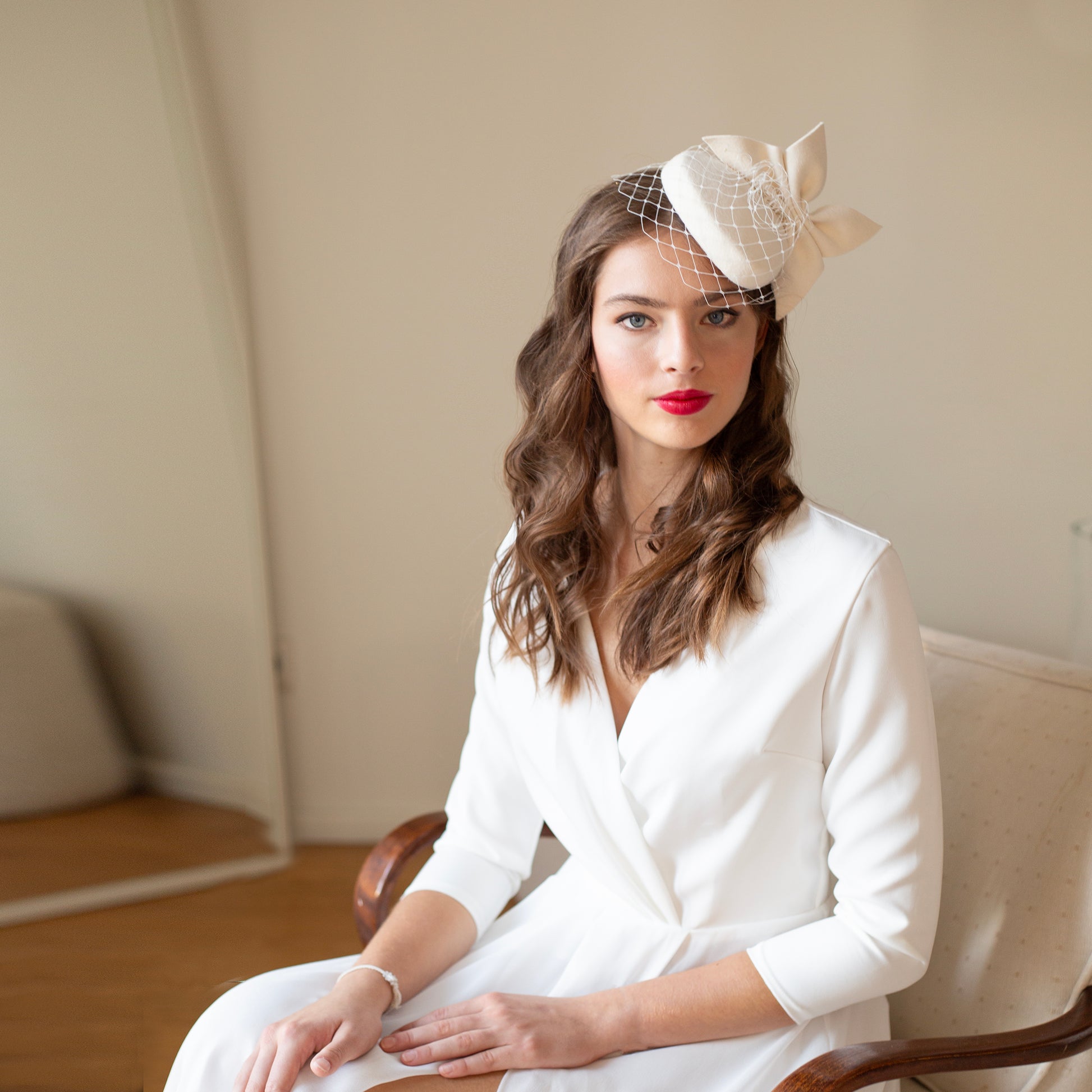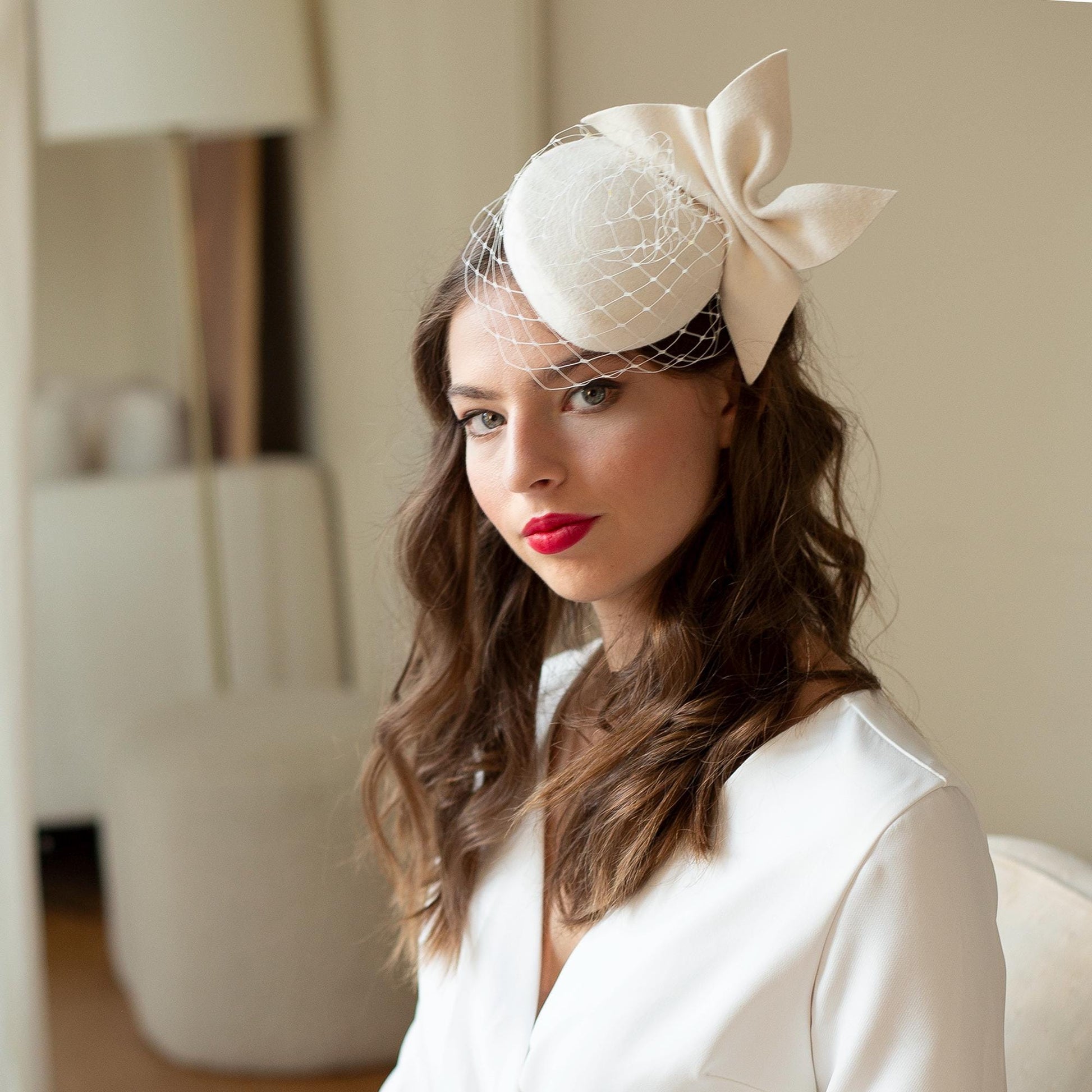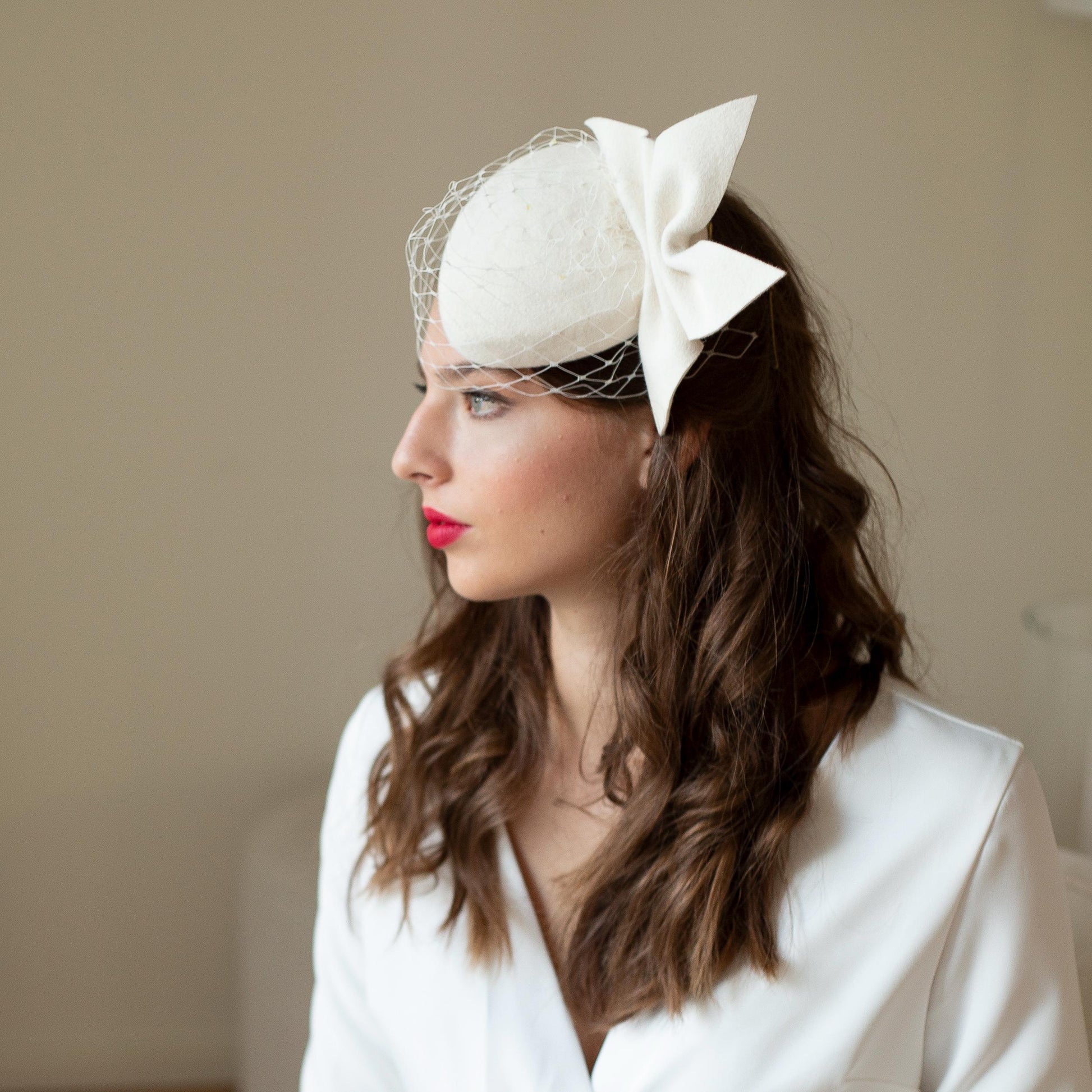 Svatební klobouk ve tvaru krabičky: Moderní ozdoba hlavy s mašlí a síťkou - Zimní svatba