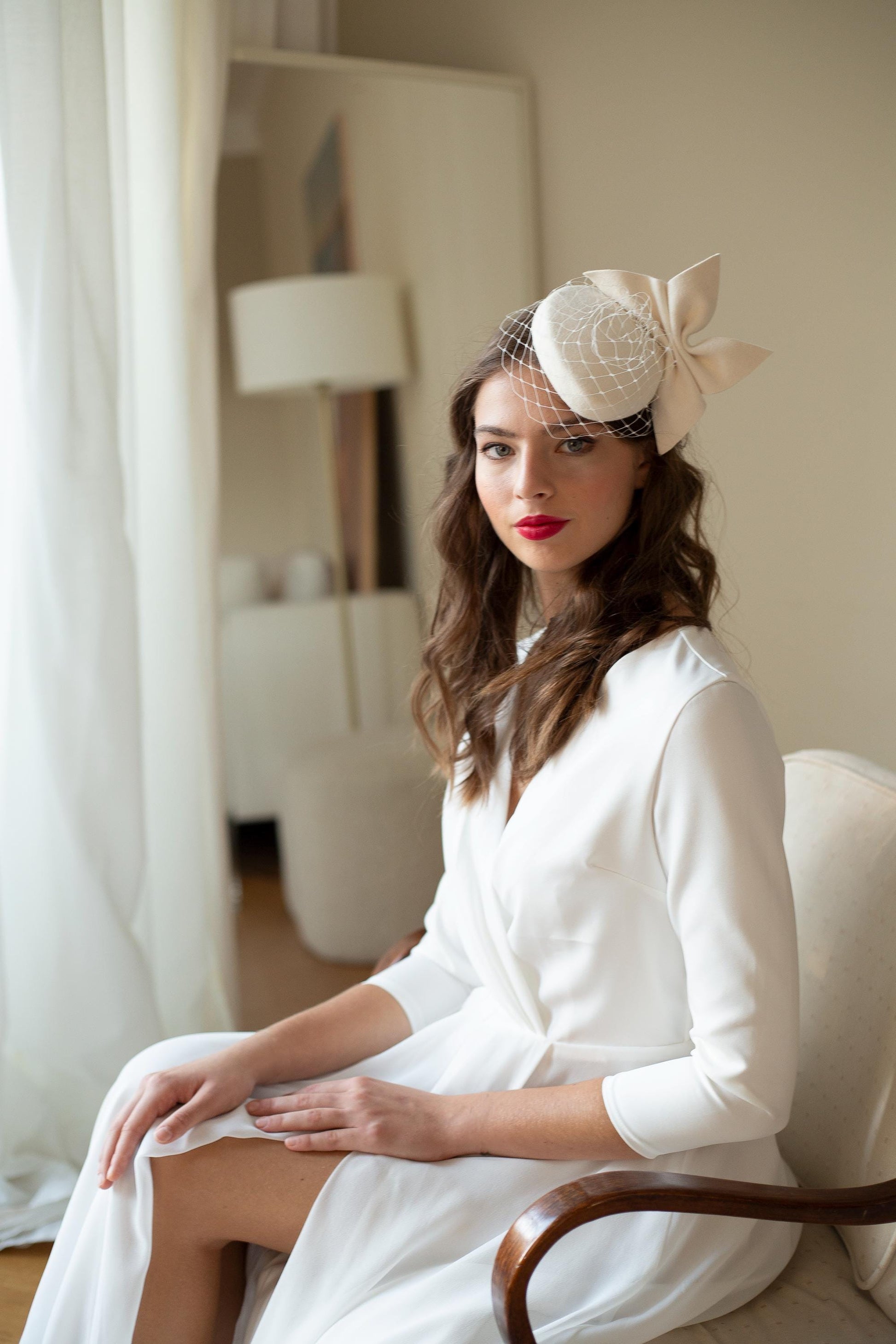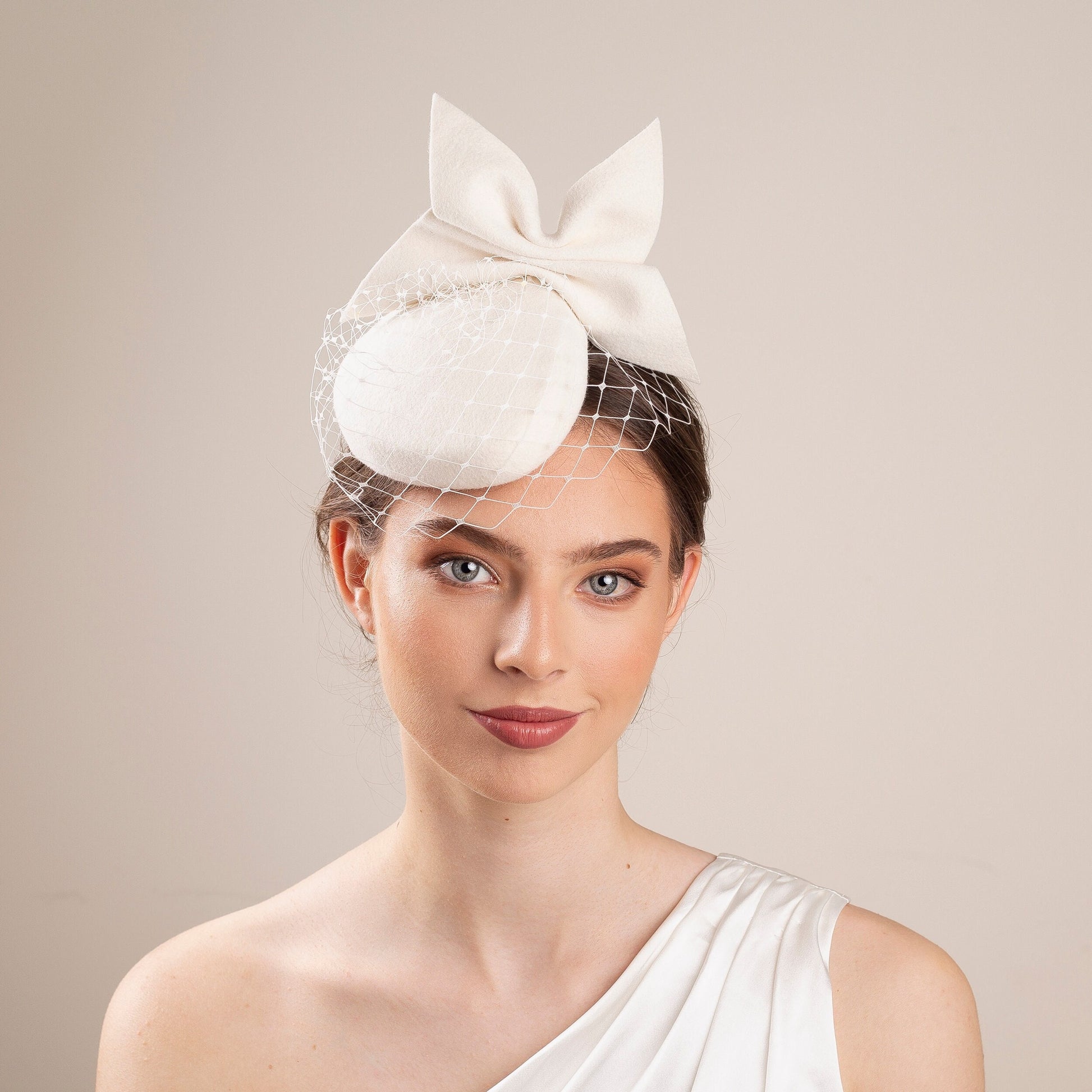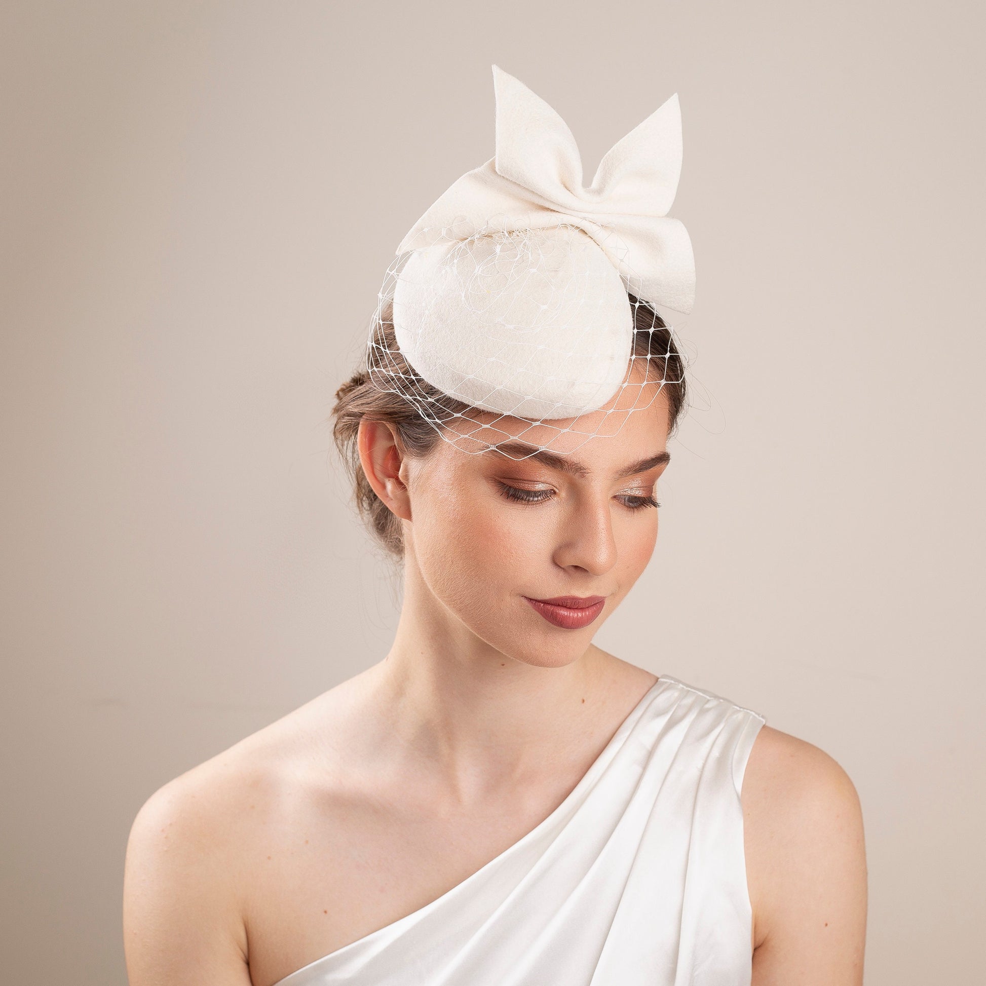 Svatební klobouk ve tvaru krabičky: Moderní ozdoba hlavy s mašlí a síťkou - Zimní svatba