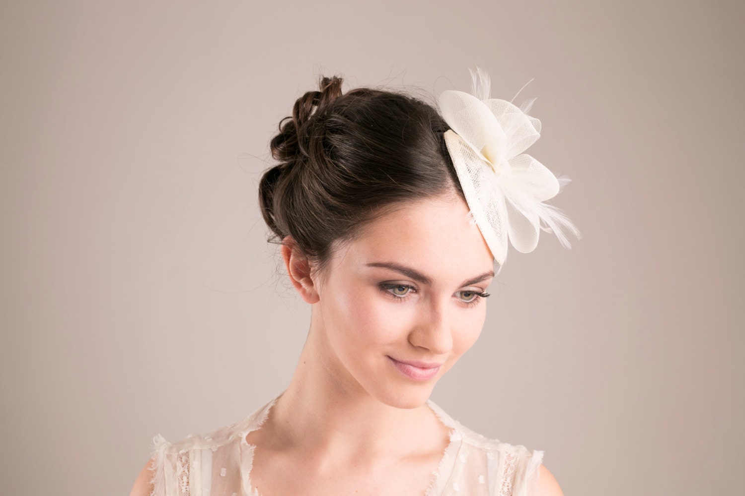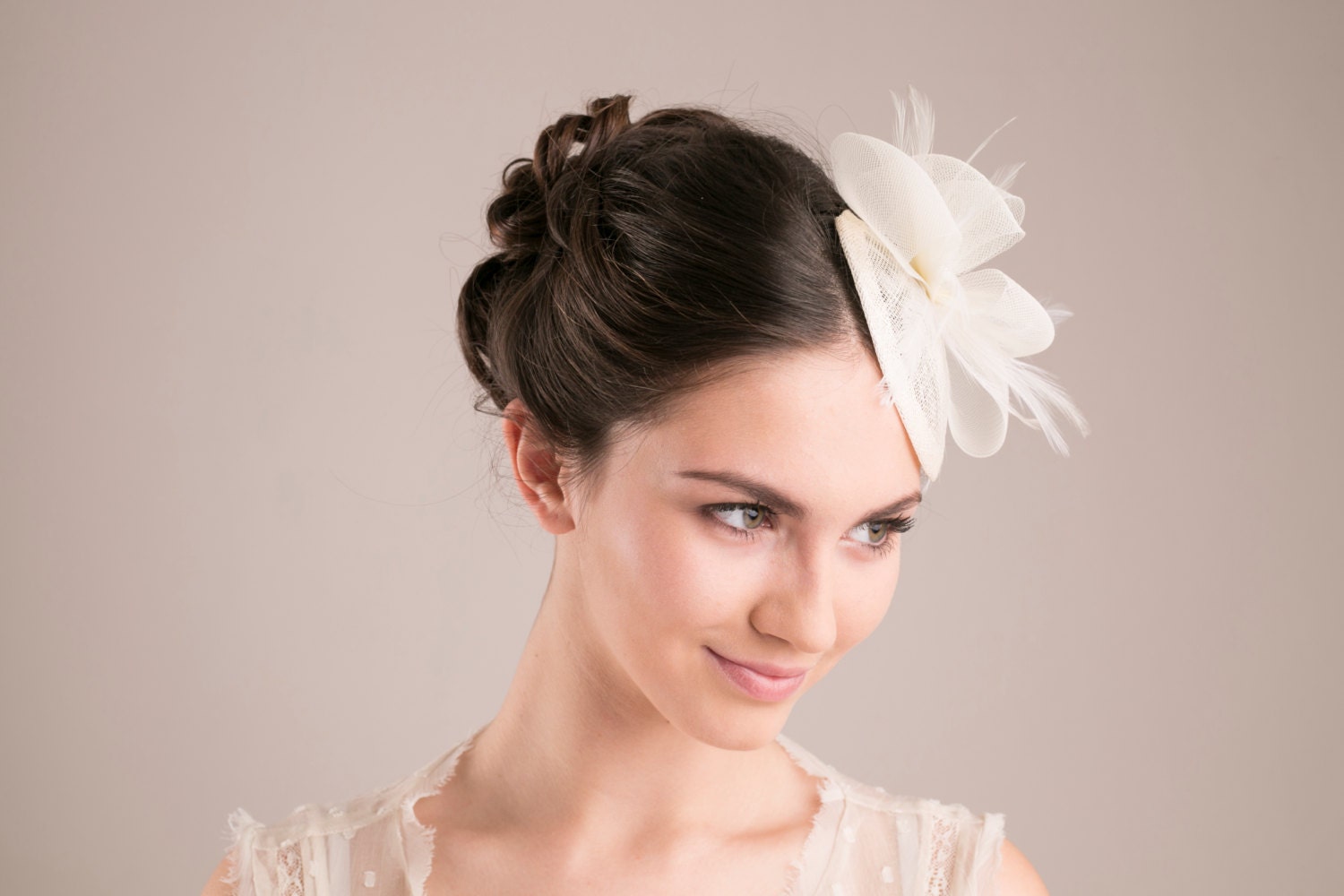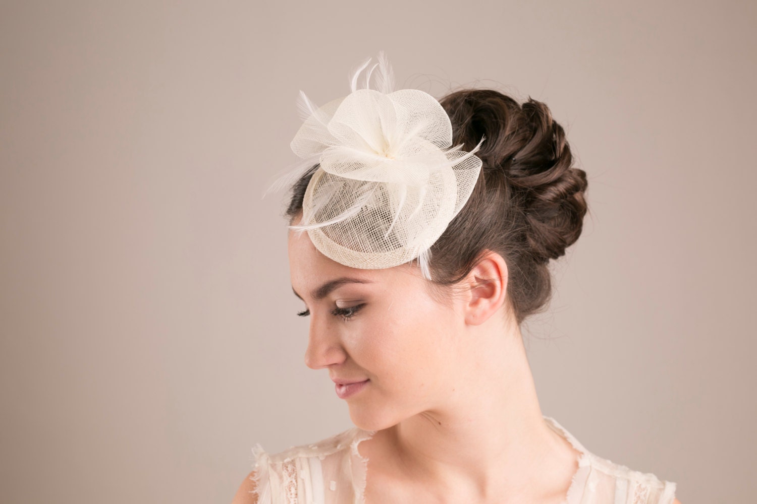 Svatební klobouk s kloboučkovým vzorem je vhodný pro svatbu ve vintage stylu, ale vypadá úžasně i s moderními šaty. Klobouk je kompletně ručně vyrobený tradiční kloboukovou technikou - použila jsem několik vrstev sinamay, vyztužila jsem ho drátem pro dlouhou životnost a ozdobila peřím a krinolínovými mašlemi.