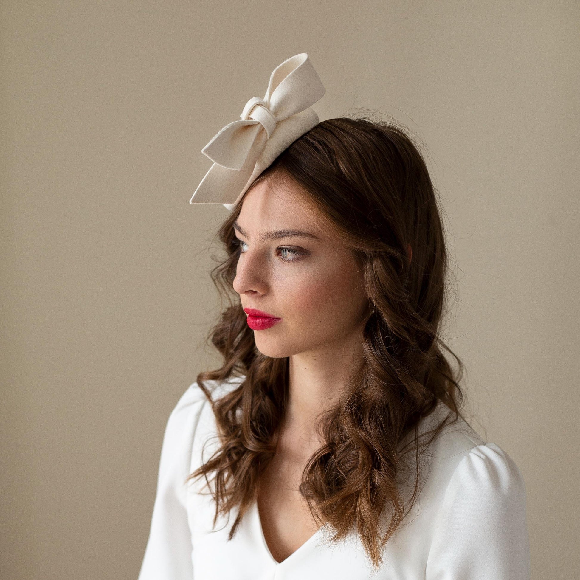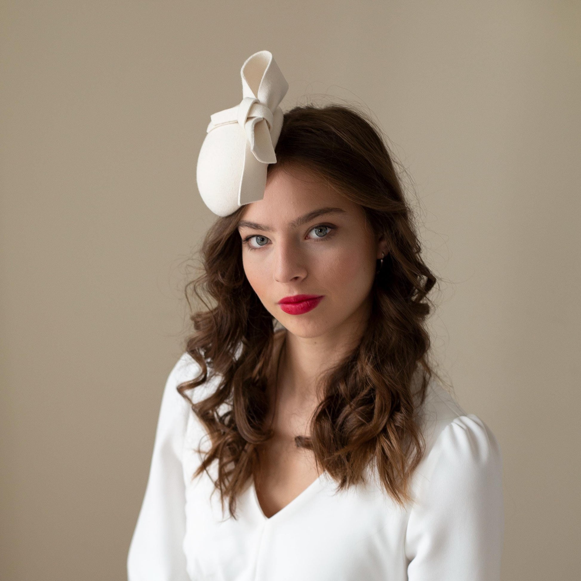 Tento svatební klobouk ve tvaru krabičky v barvě slonové kosti má elegantně umístěnou dvojitou mašli na boku. Jeho minimalistický a čistý design se bez problémů hodí k různým stylům svatebních šatů nebo svatebních obleků.