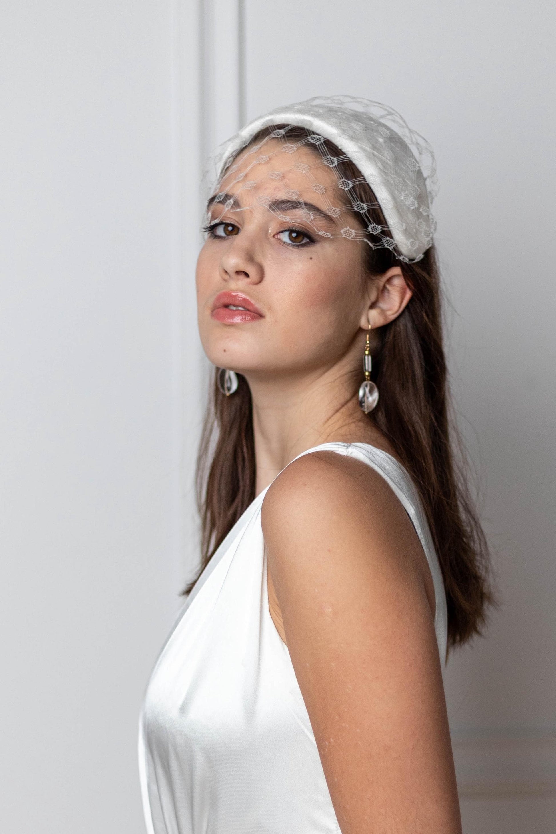 Svatební čelenka z hedvábného saténu s vintage závojem ve stylu Birdcage, styl Grace Kelly