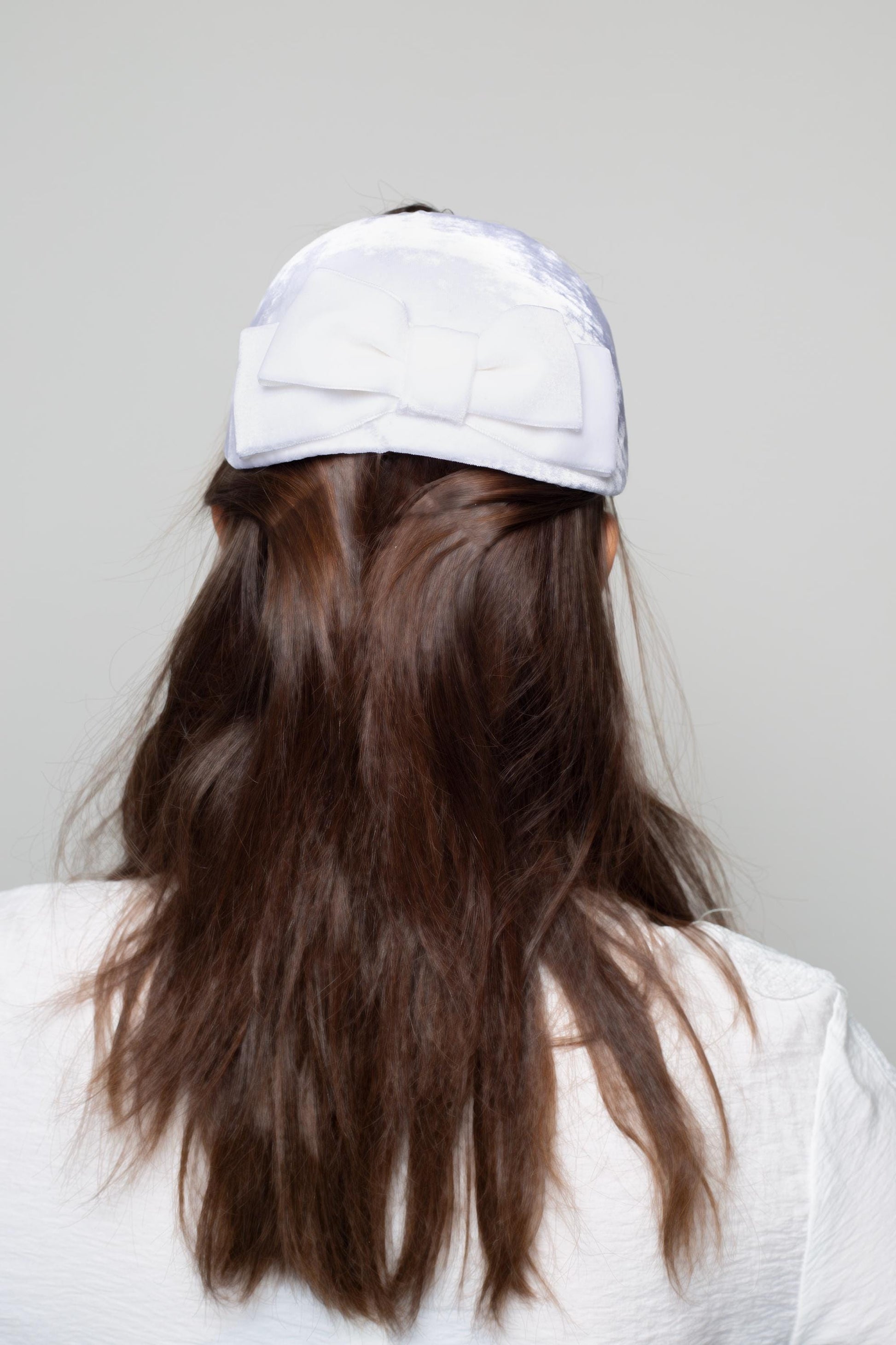 Ručně vyrobená hedvábná sametová čepice je ozdobena dvojitou mašlí ze stejné látky. Lze ji kombinovat s jakýmkoli typem závoje.