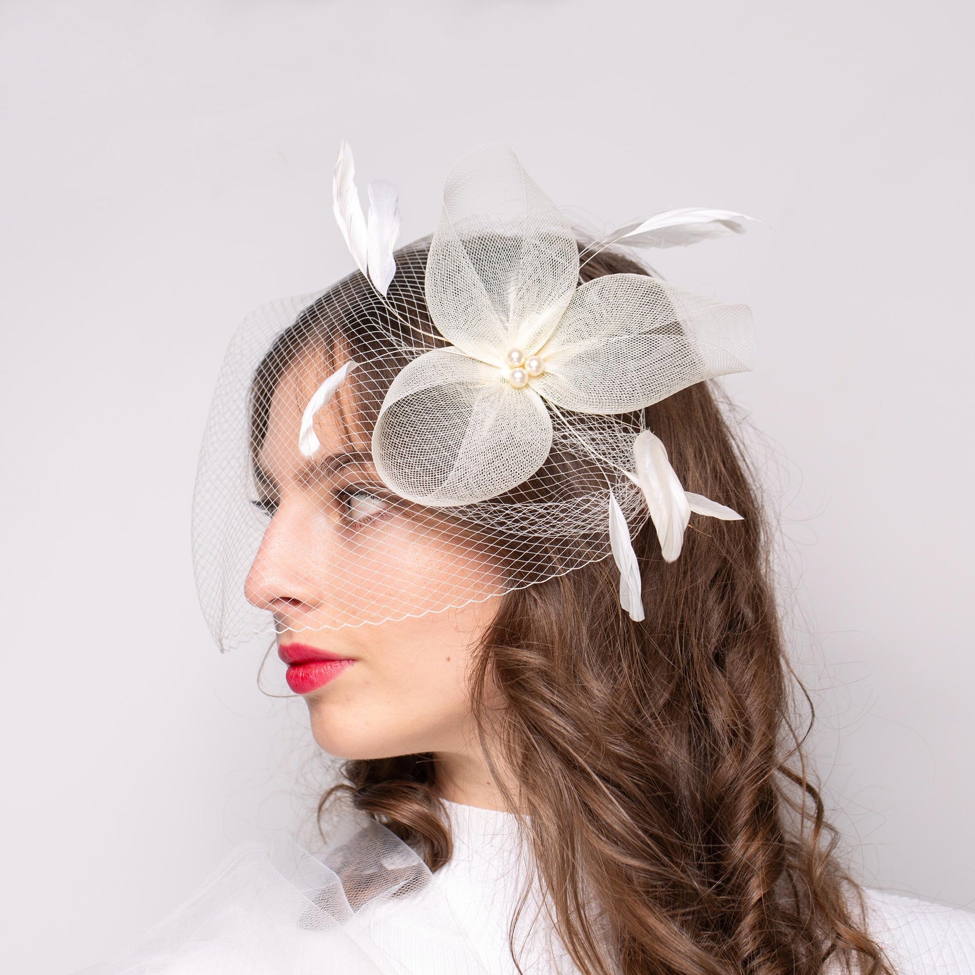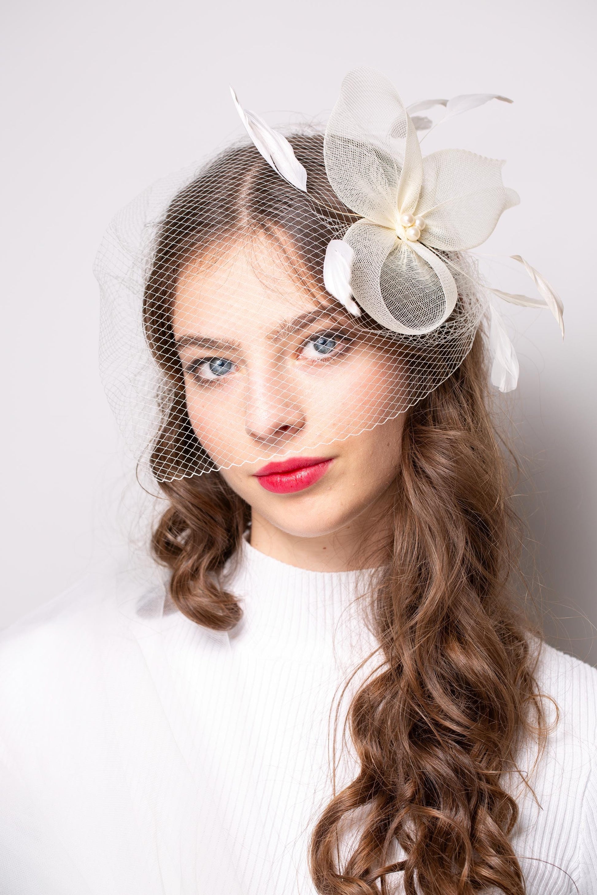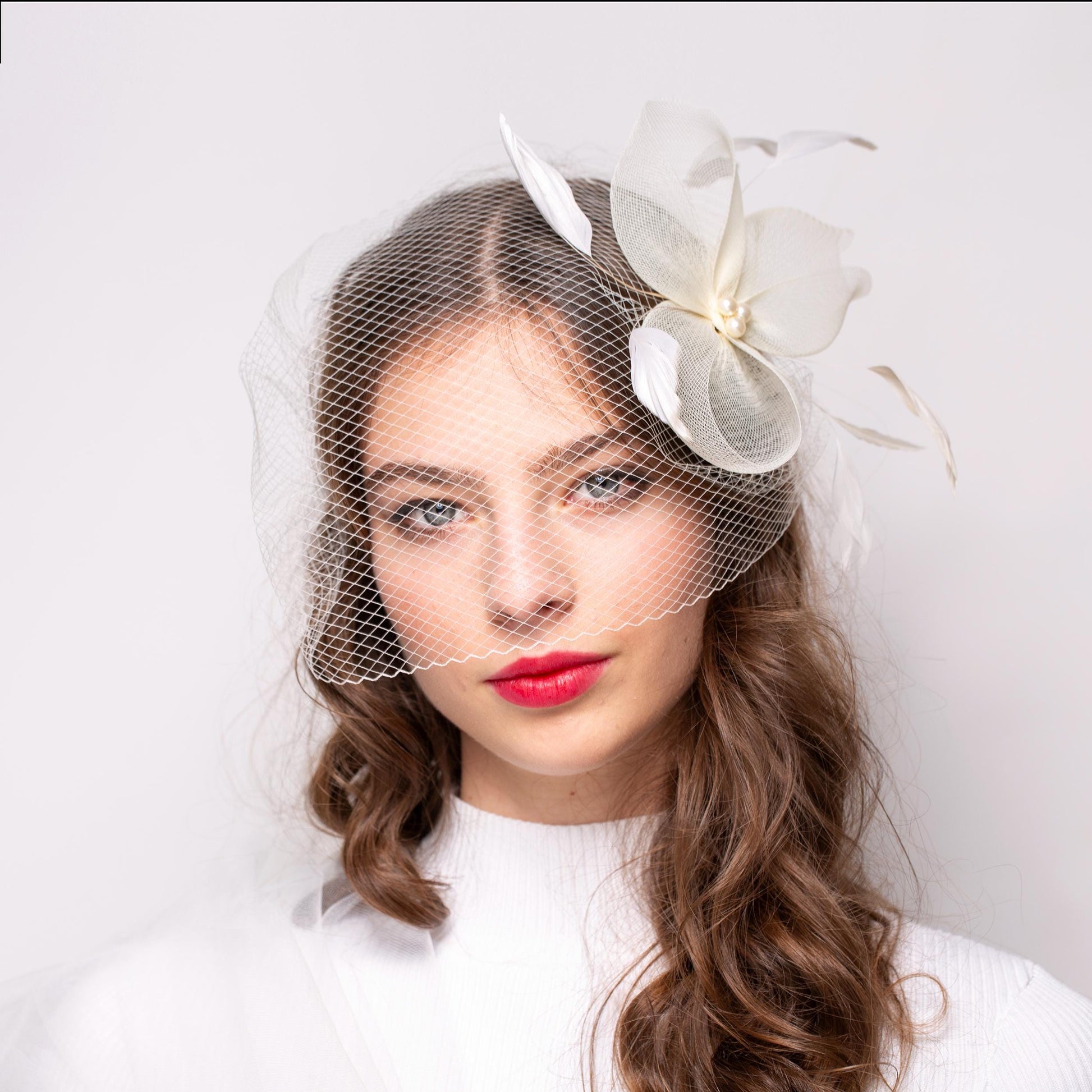 Tento elegantní svatební závoj je ozdoben velkou květinou do vlasů - čelenka je vyrobena z krinových smyček s ručně šitými perlami Swarovski a peřím ve stejném odstínu. Krátká ptačí klec je vyrobena z vintage síťoviny ze 70. let pocházející z kloboučnictví v Německu. Fascinátor je připevněn k aligátoří sponě pro snadné umístění do jakéhokoli účesu. Klec je zavěšena na dvou špendlících.
