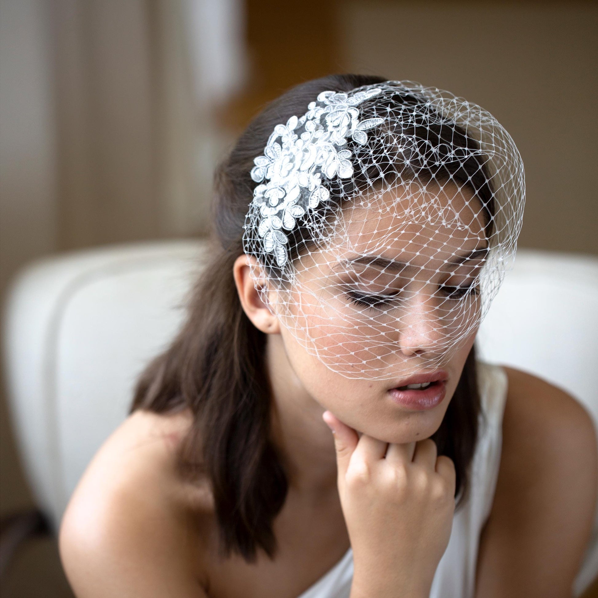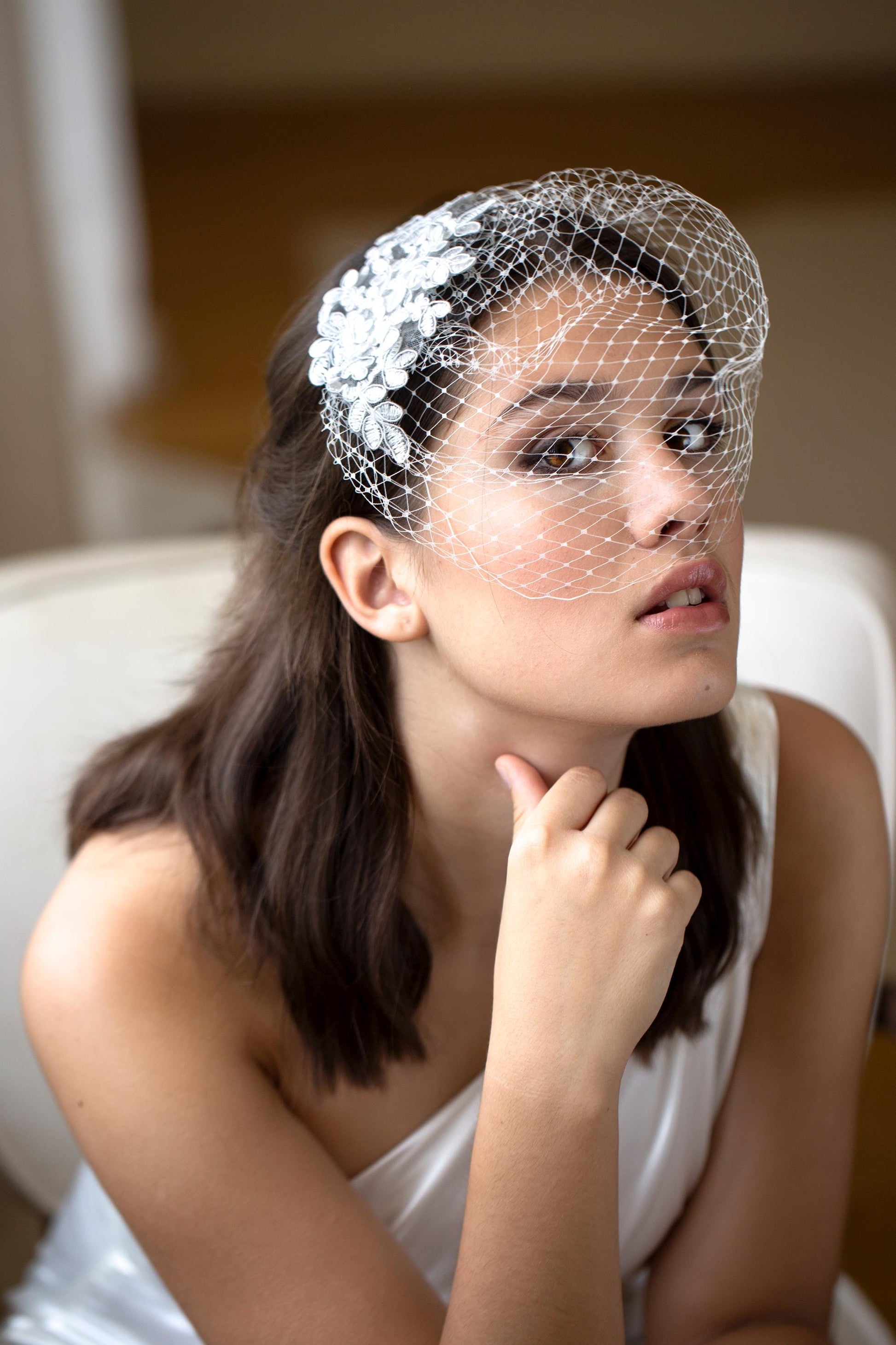 Tento vyvážený a symetrický závoj ve tvaru ptačí klece, ručně vyrobený z jemné kloboučnické síťoviny a zakončený jemnými květinovými krajkovými detaily, nabízí nenucené kouzlo. Pevně drží na místě díky tenkému plochému hřebenu, který se plynule schovává do vašeho účesu.
