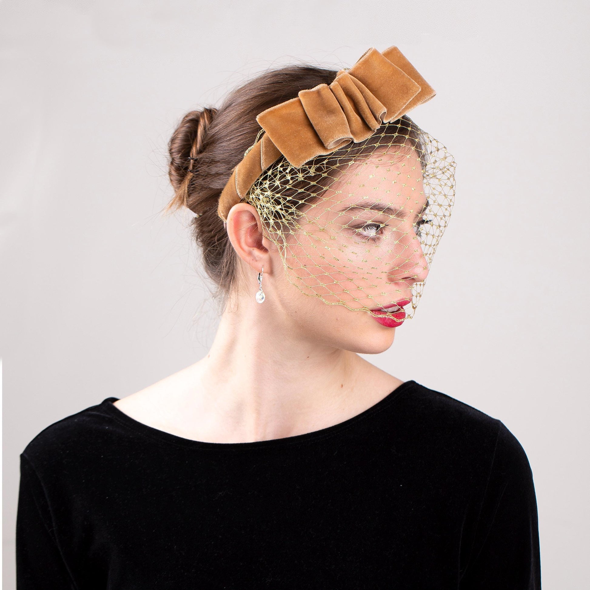 Der warme beige Samt ist gerüscht und von Hand auf ein bequemes, breites Haarband genäht. Der Schleier ist abnehmbar; Sie können das Haarband auch ohne Schleier tragen.