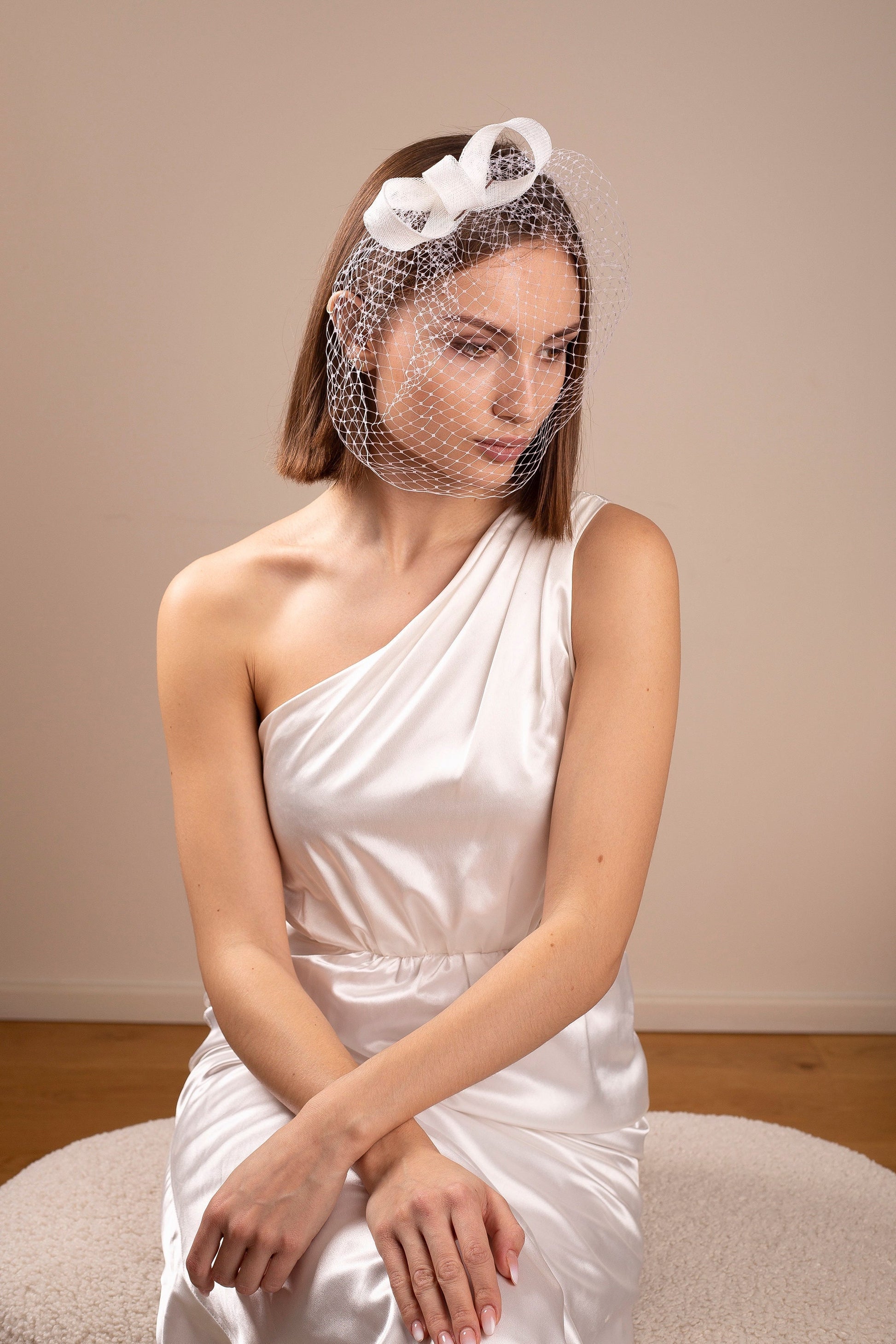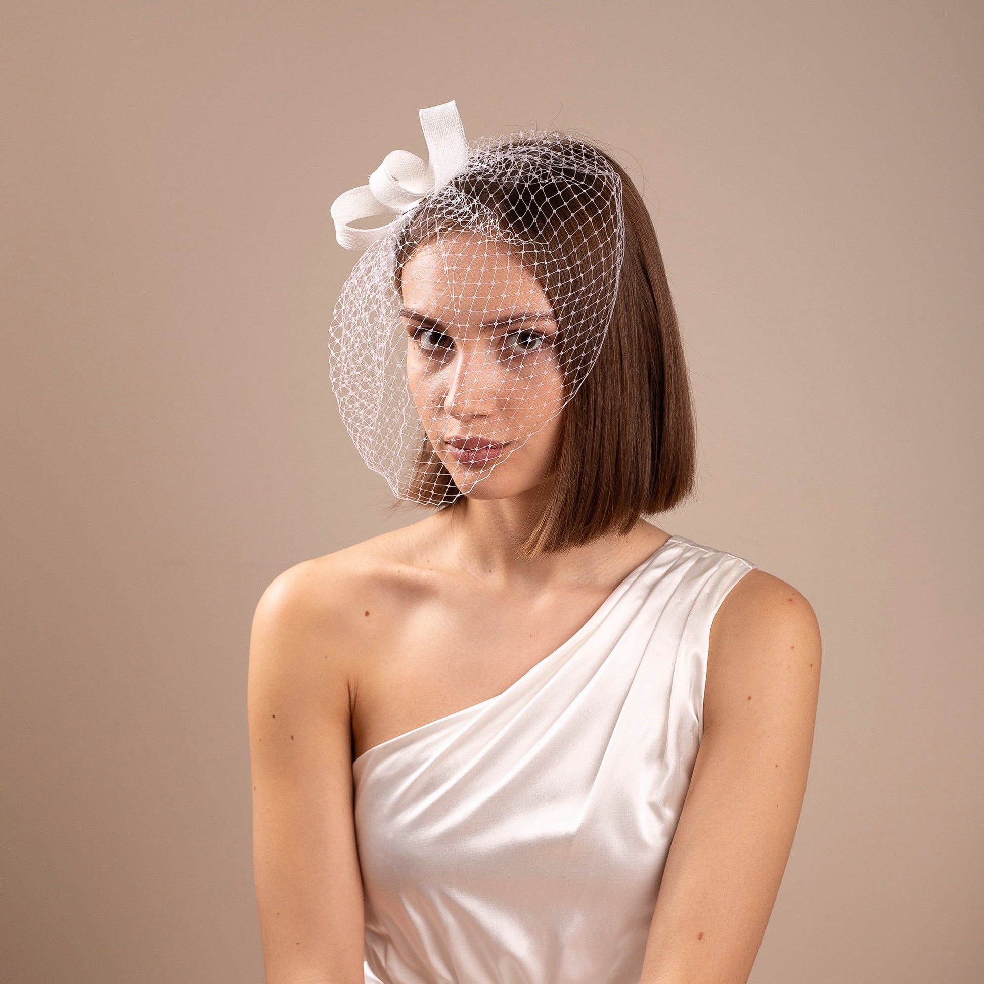 Weißer Braut-Fascinator im Birdcage-Stil, kurzer Gesichtsschleier, minimalistischer Hochzeits-Haarschmuck mit Netz
