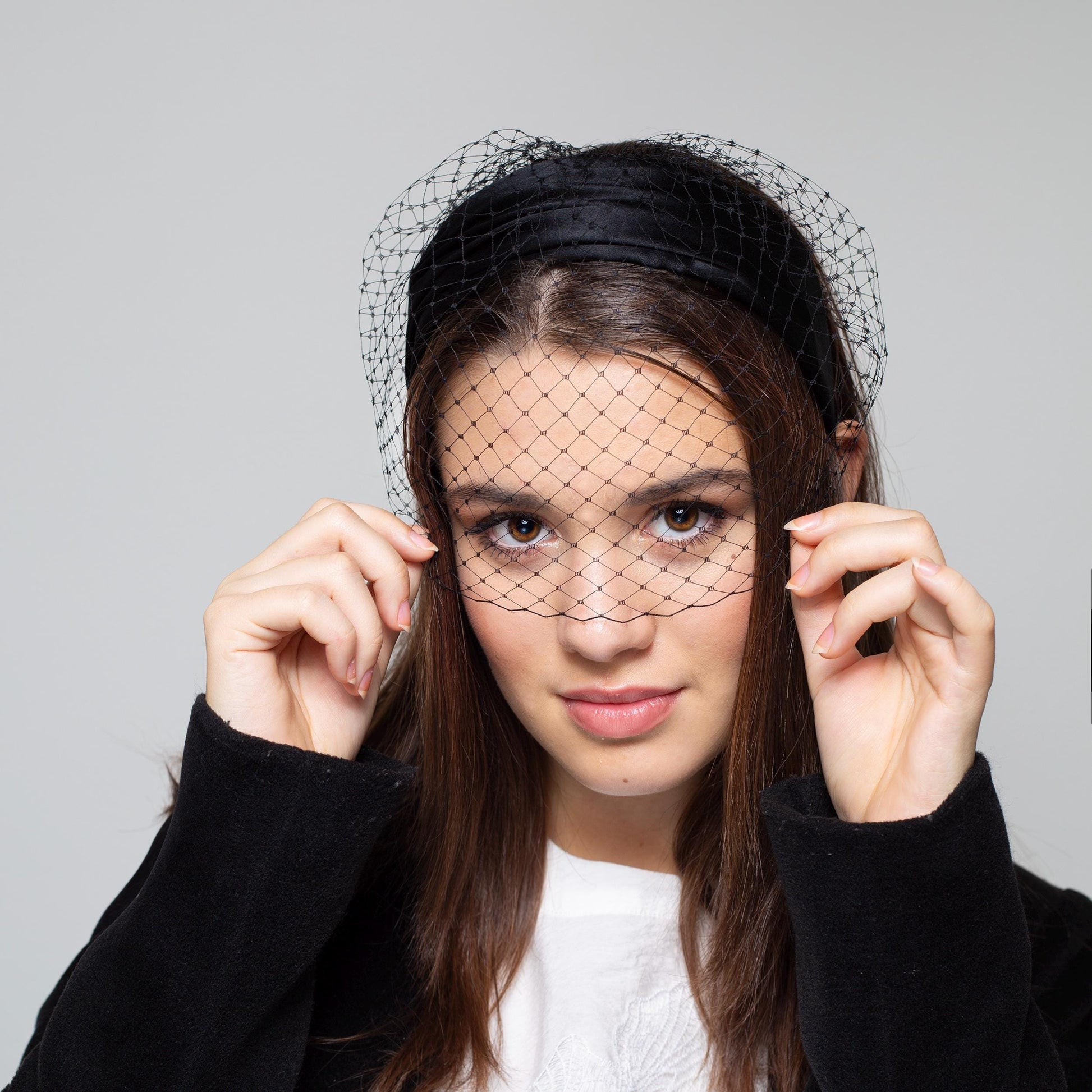 Black silk satin draped headband with removable birdcage veil, handcrafted wedding headpiece for special occasion