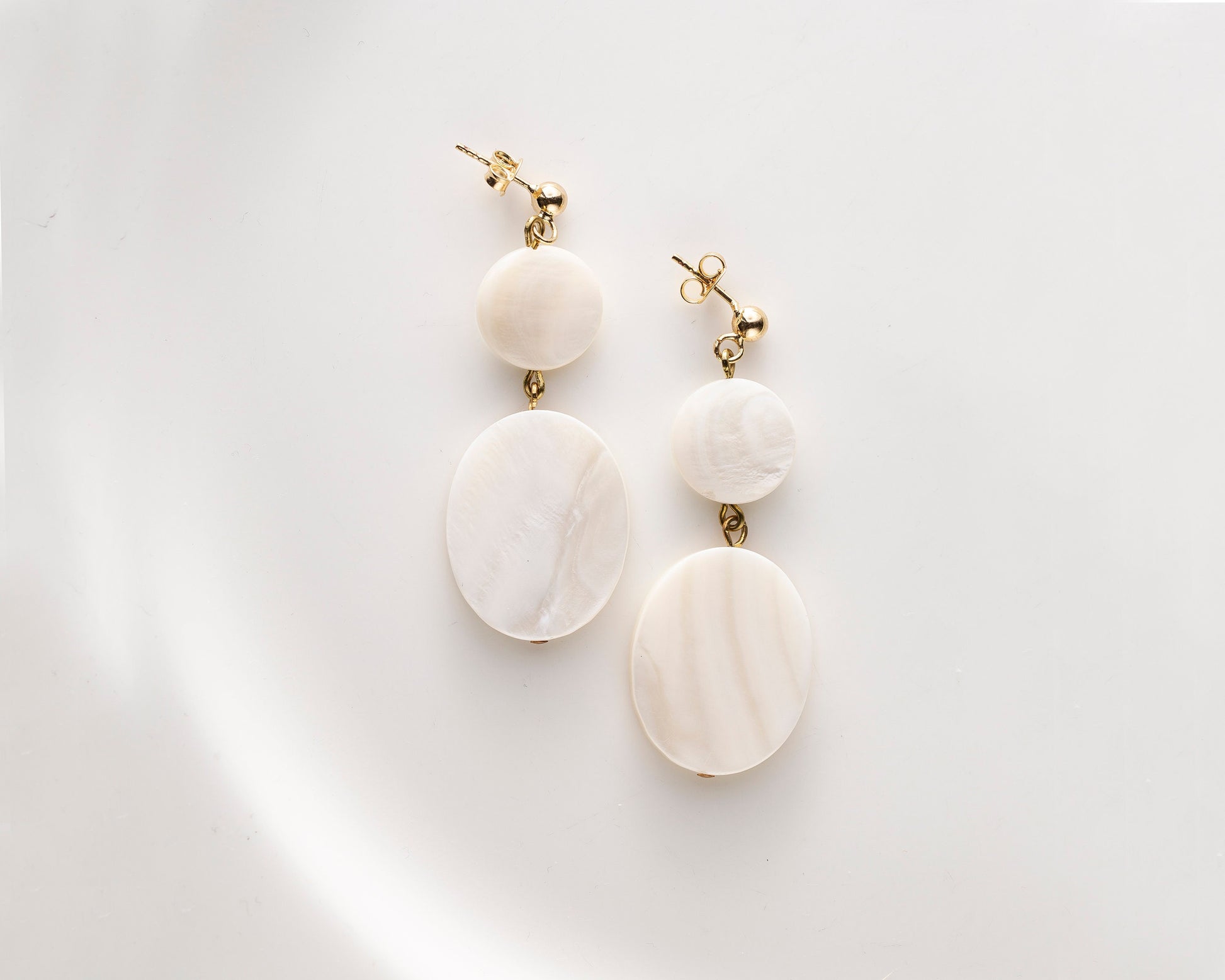 Drop earrings with lustrous mother-of-pearl shell in natural off-white shade. Each stone is handcut, unique in shape and structure. You will receive exactly the same pair as in the picture. The second picture shows the back side of the earrings. Total length is 63 mm. Earstuds with 4 mm ball is 14 kt gold filled.