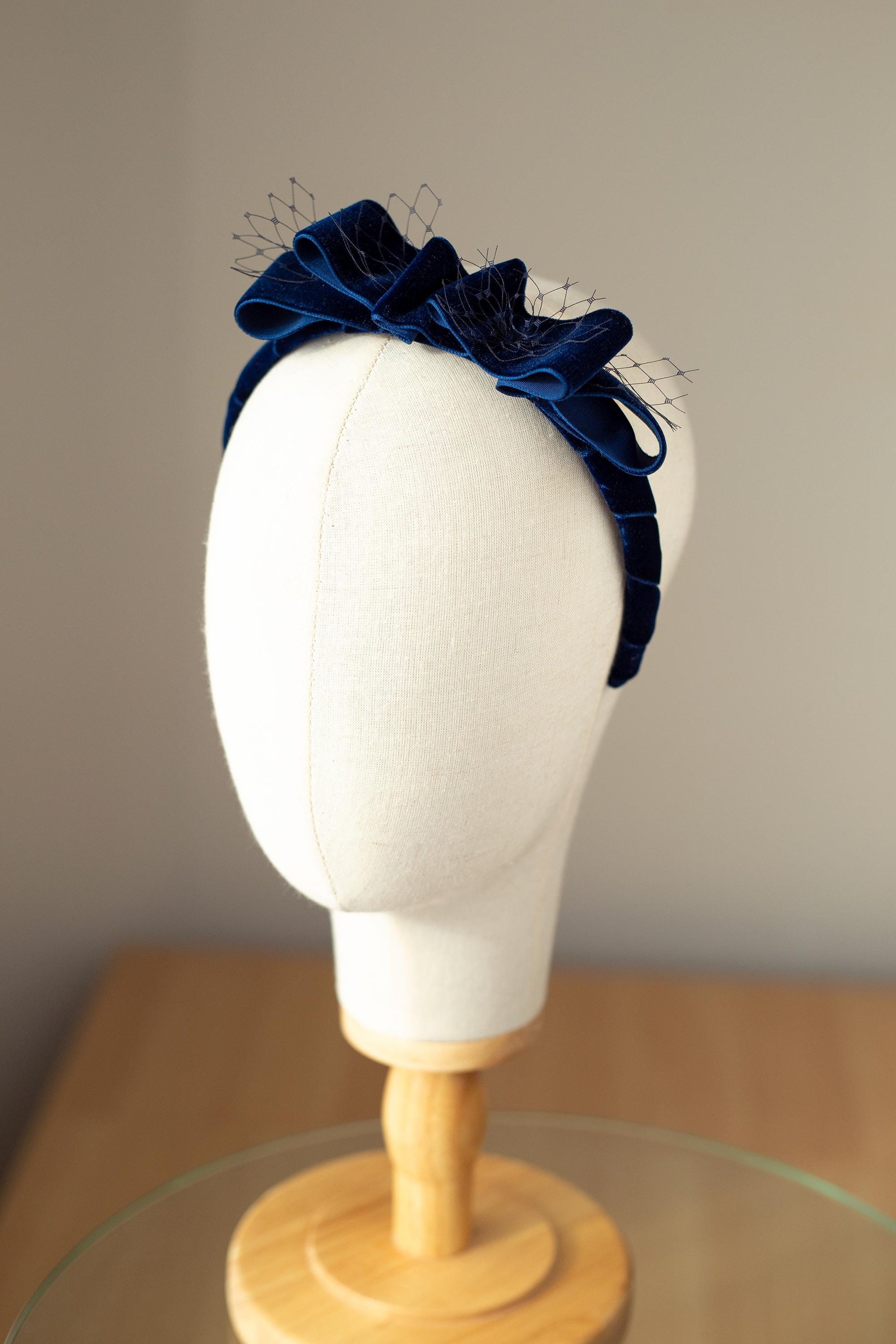 Navy Velvet Bow Headband: Vintage Ribbon & Netting Headpiece