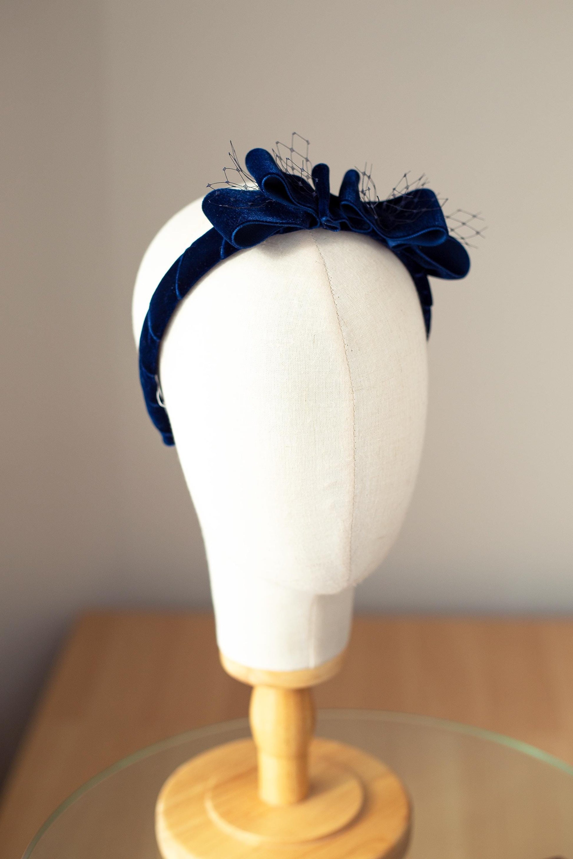 This velvet headband in elegant navy colour is made of vintage velvet ribbon sourced in Germany. The velvet is ruffled and handsewn onto a comfortable wide headband, adorned with netting accents.