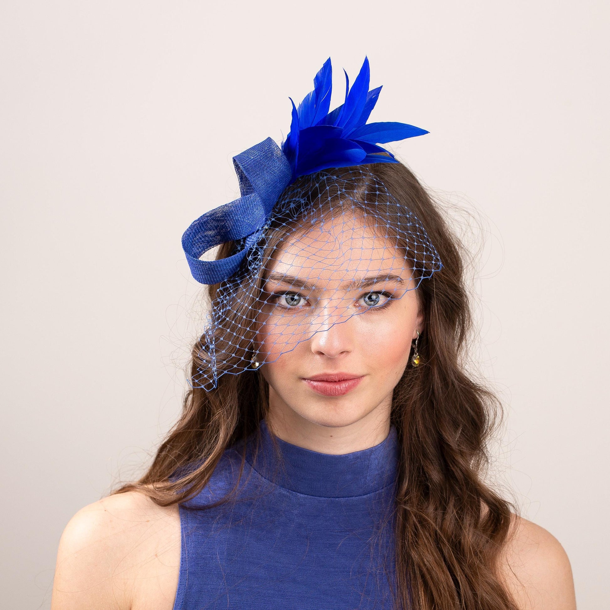 Royal Blue Feather Fascinator for Wedding Guests, Formal Occasion Headpiece for Netting Veil