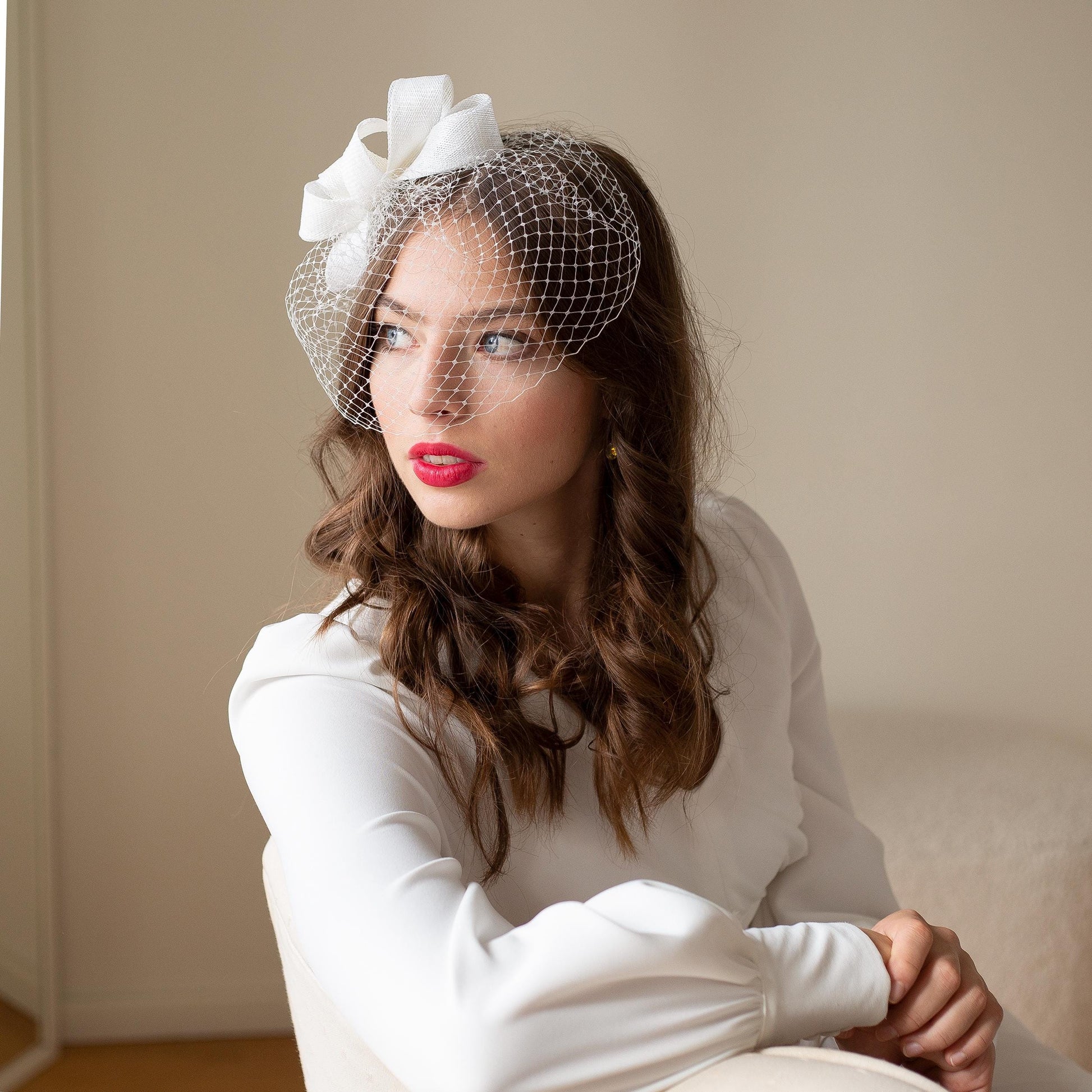 White wedding birdcage with bow headpiece, white bow fascinator, formal headpiece for a bride, elegant wedding hair accessory