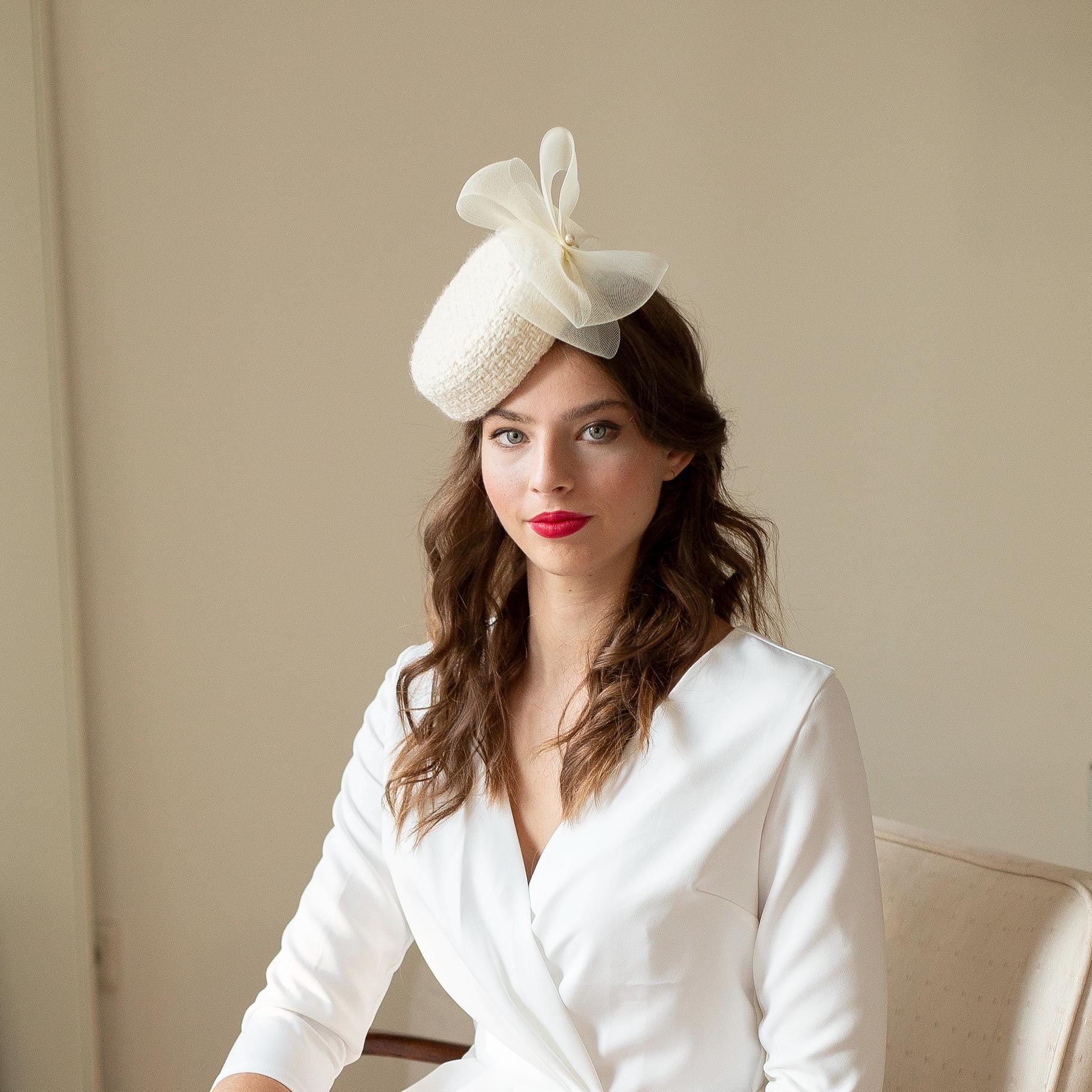 Bridal Wool Tweed Pillbox Hat: Cream Flower & Pearls Winter Wedding