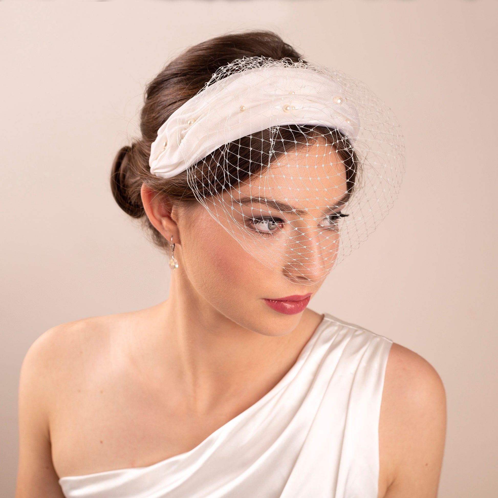 This Hollywood glam style Bridal Headband features a ruffled silk organza design on a handmade millinery headband, adorned with hand-sewn scattered Swarovski pearls. This version comes with a classic birdcage veil that gently reaches to the eyes, adding an elegant 1950s touch. Colour: ivory Material: silk dupion, organza, Swarovski pearls