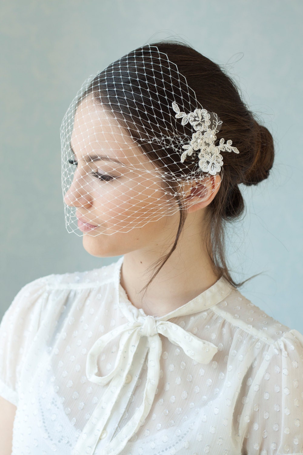 Delicate floral lace with hand sewn Swarovski pearls are focal points of Pearls Bridal Bandeau Veil. Crafted from fine ivory veiling, this short veil is a timeless and sophisticated choice for a bride. The meticulously hand-sewn floral lace gracefully adorns the veil, creating an romantic, understated look. Designed for an easy use, the veil is attached to two millinery metal combs.