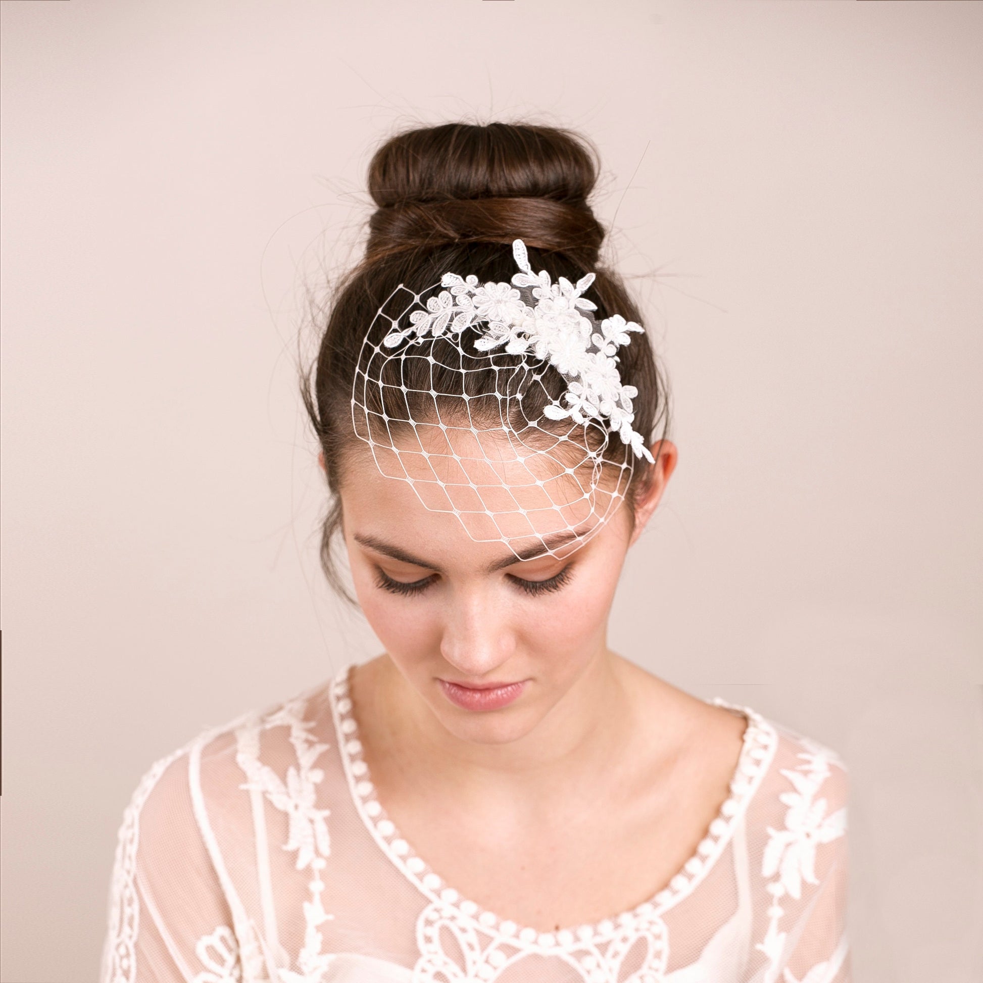 Delicate floral lace birdcage in petite size for the romantic wedding hairstyle. Perfect for brides who want just a veiling accent, not to be covered by the veil.