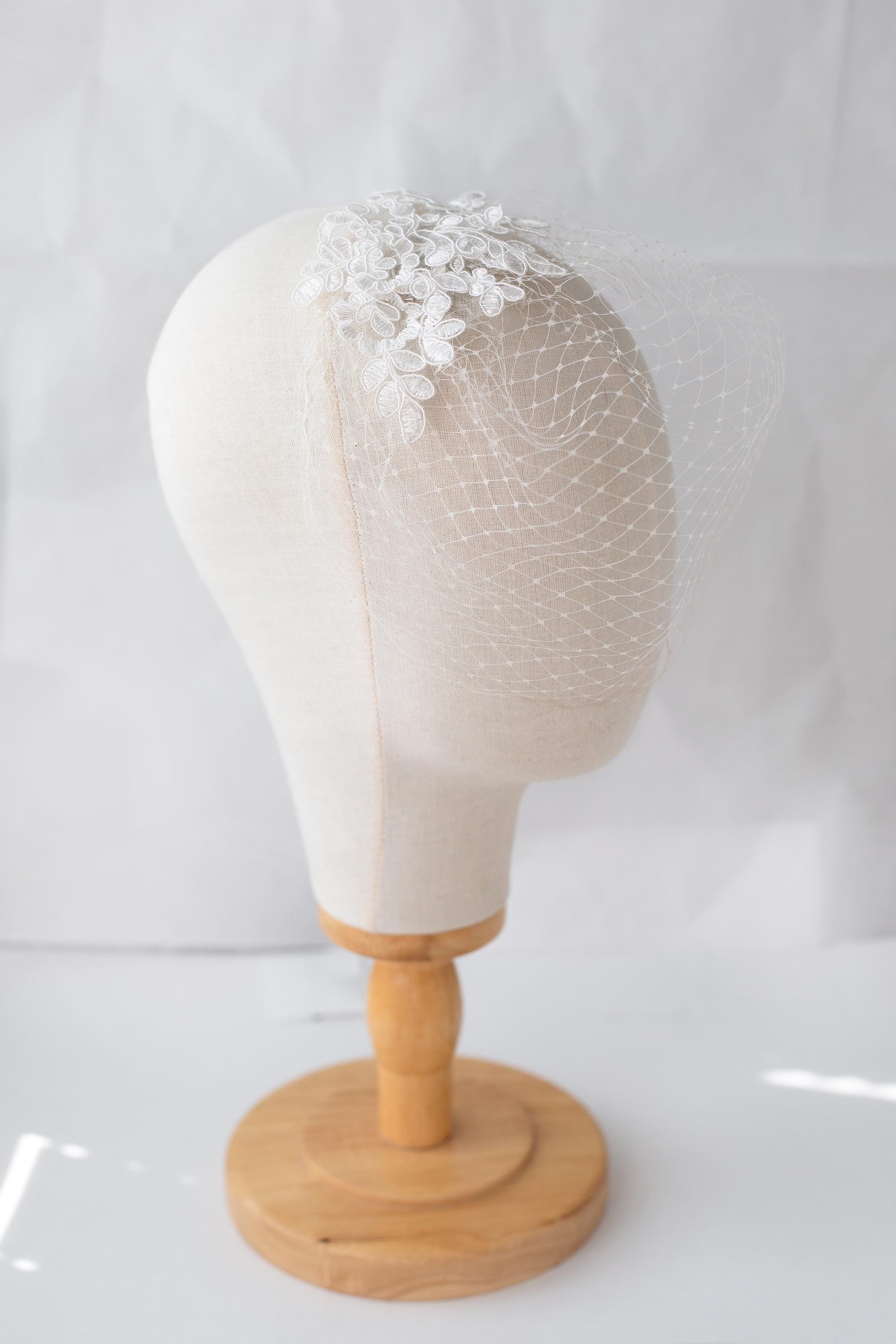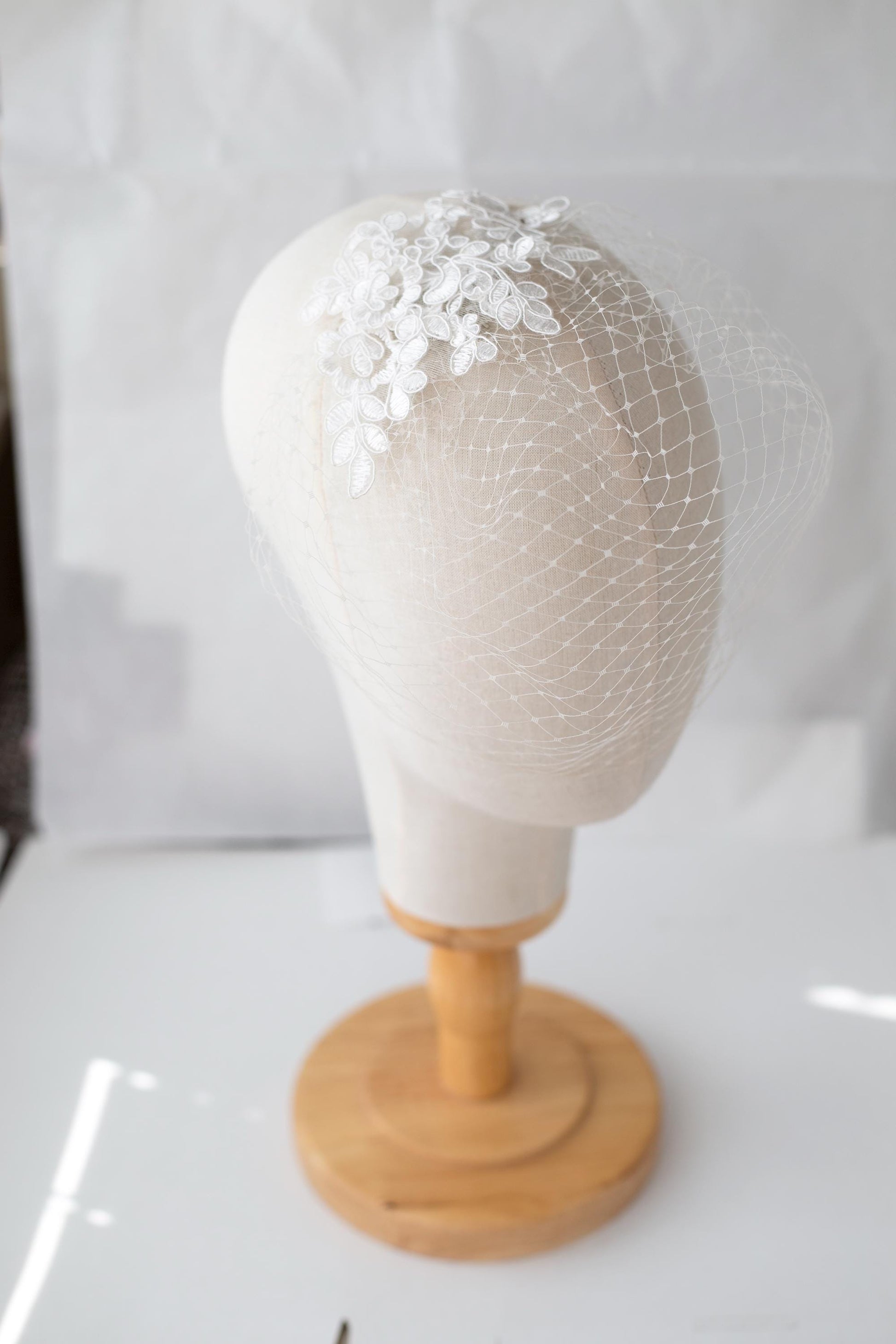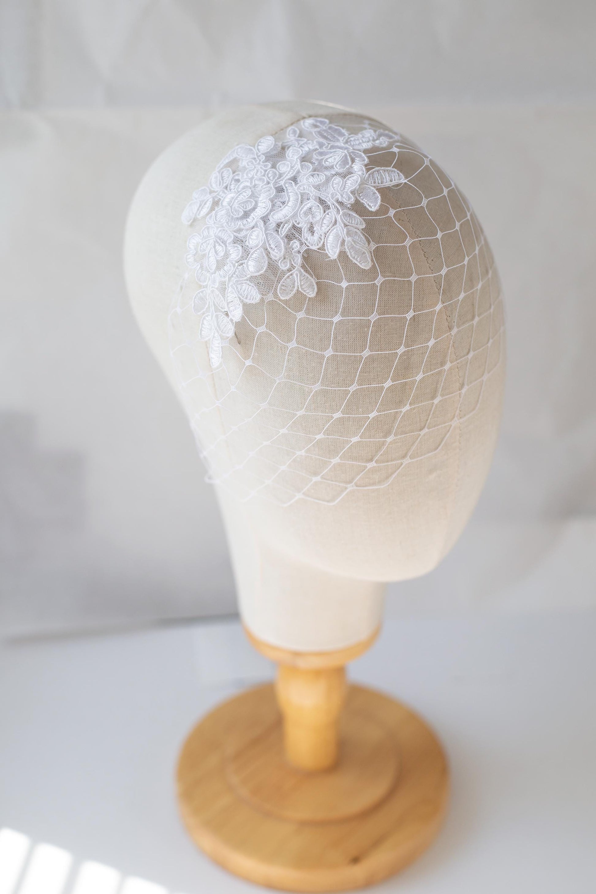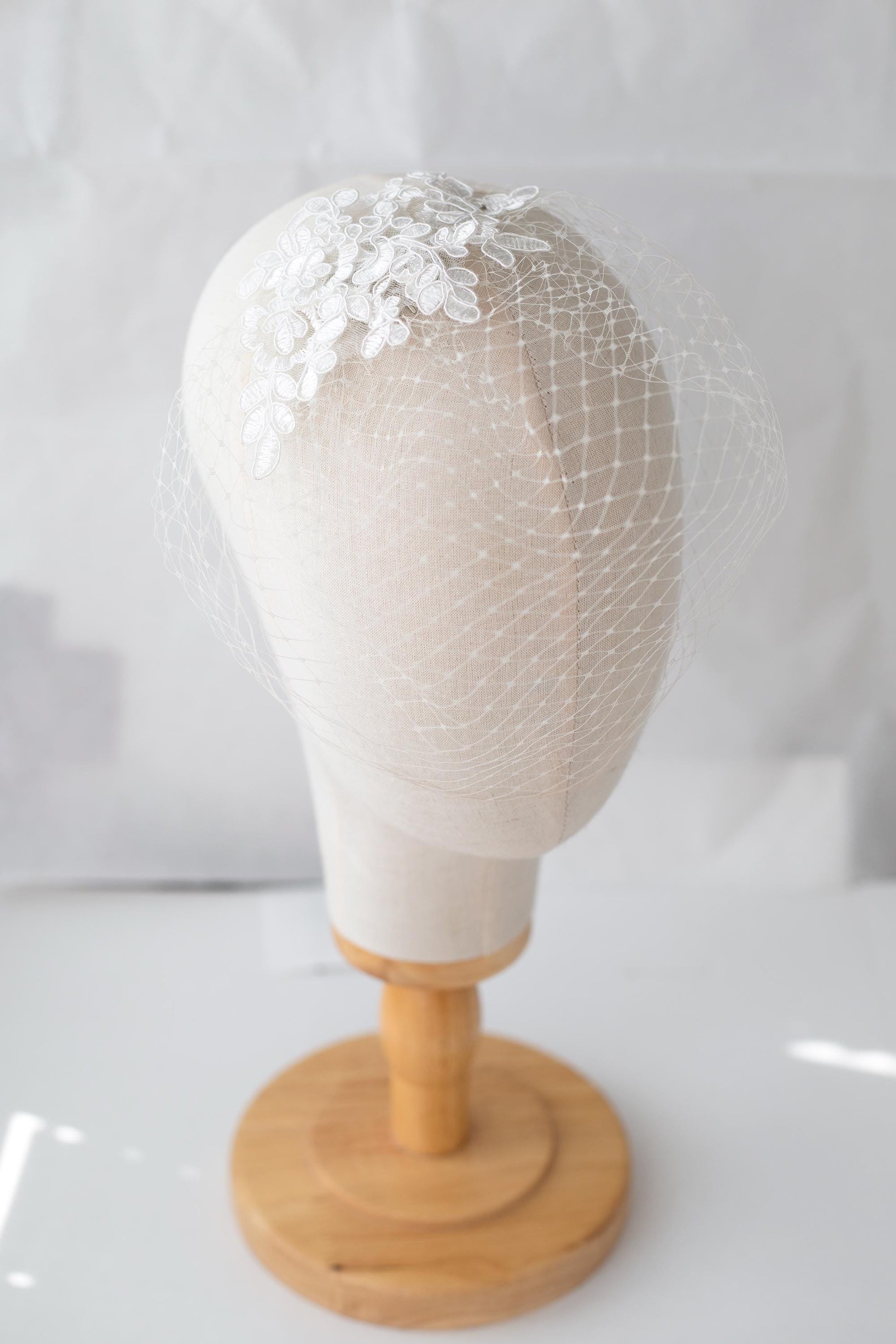 Crafted by hand from fine millinery netting and finished with delicate floral lace detailing, this balanced and symmetrical birdcage veil offers effortless charm. It stays securely in place with a slim, flat comb that disappears seamlessly into your hairstyle.