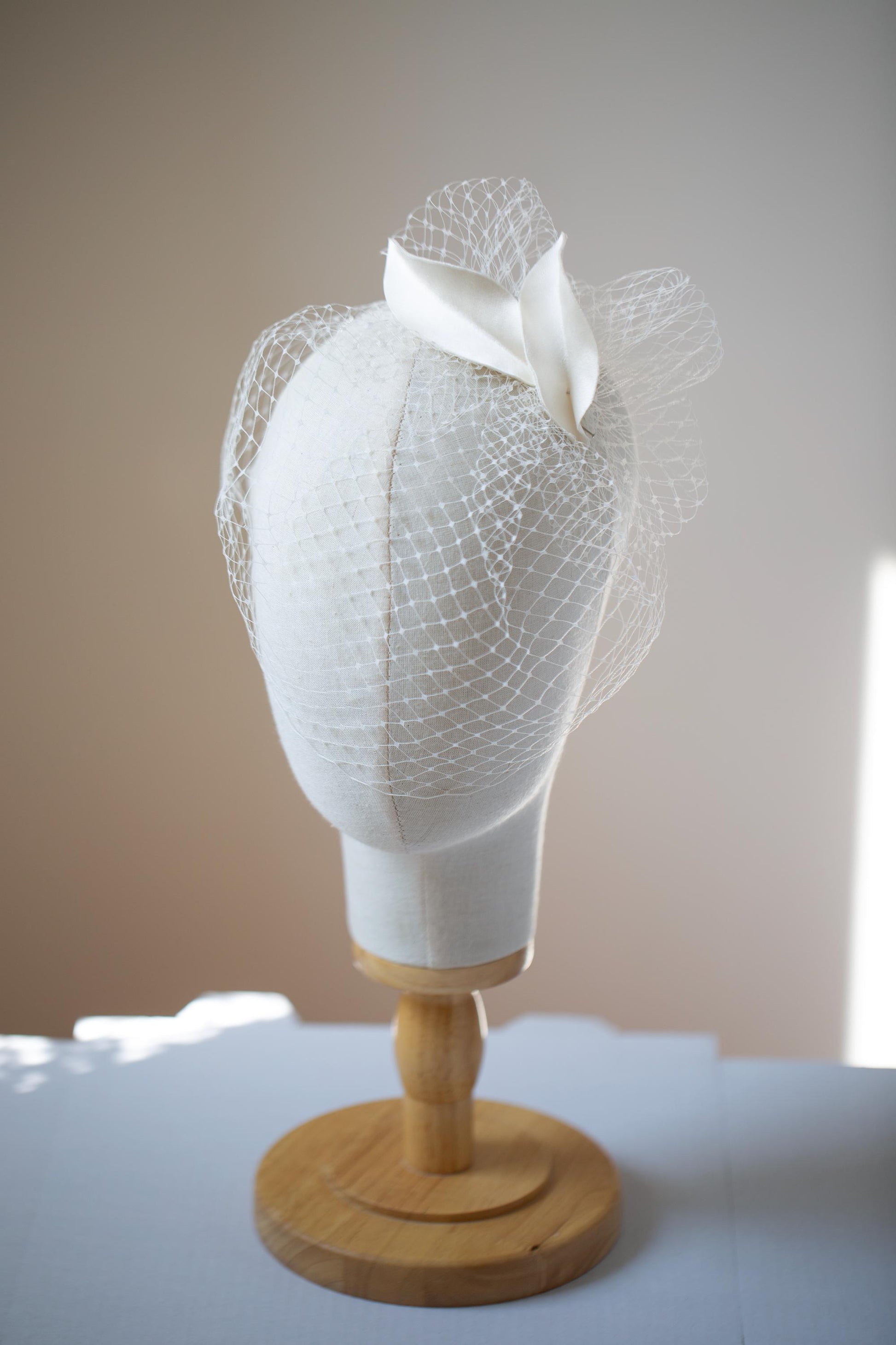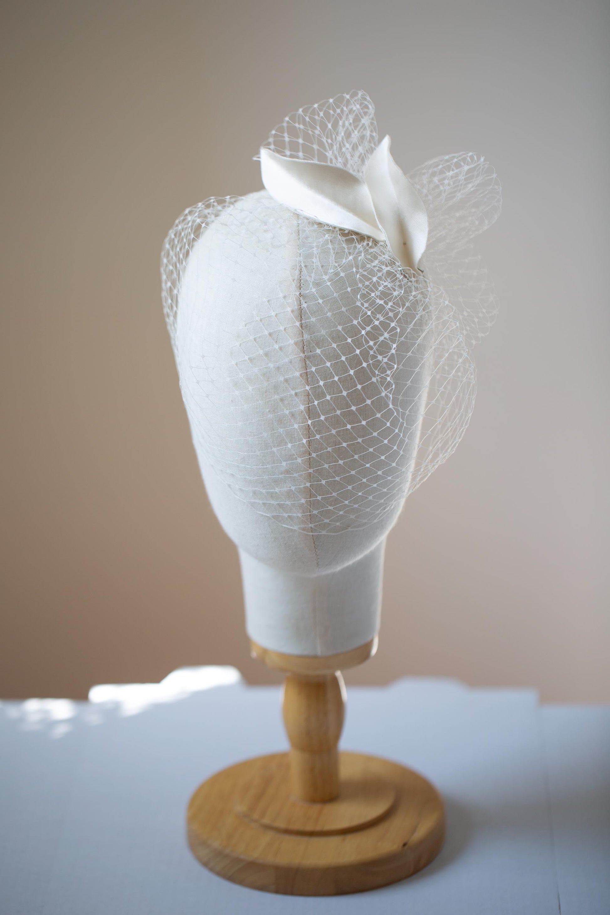 The short wedding birdcage reaches to the tip of the nose. The satin fabric is shaped using traditional millinery technique. Both attached to a flat metal hair comb - easy to place and style it yourself.