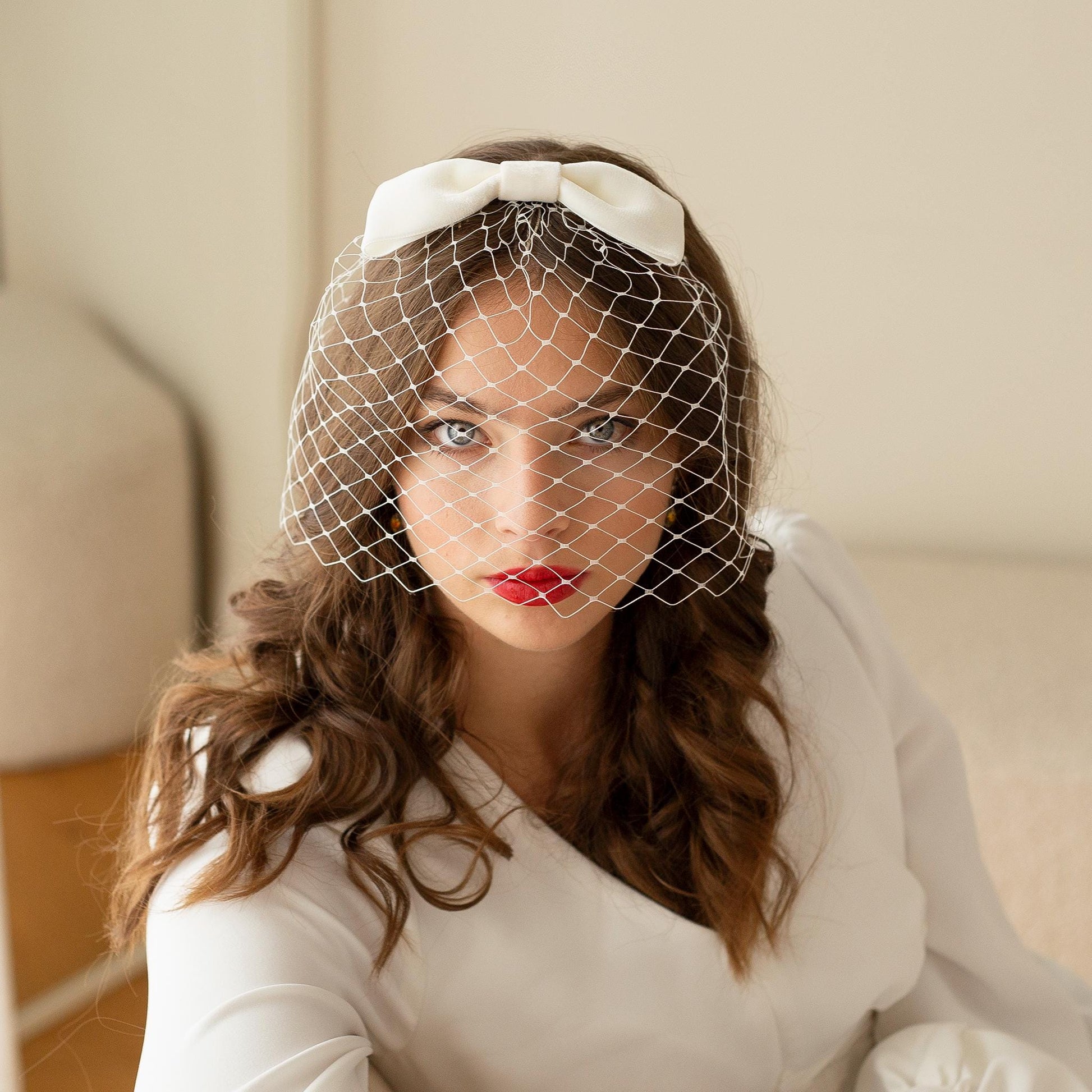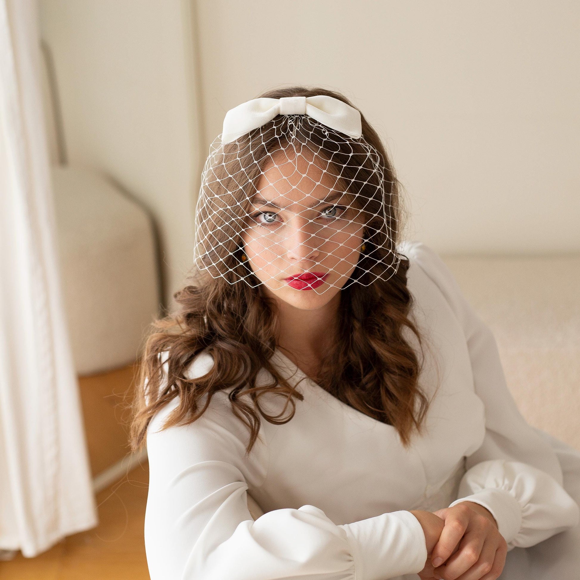 This velvet bow veil is the perfect statement accessory to create a modern bridal look. Perfect for a city wedding or civil ceremony. A short birdcage veil sits underneath a large velvet bow, made of rare vintage ribbon from 70s in Germany. It can be paired with a short, fitted shift style dress as well as elegant bridal gown. The birdcage is attached to a 10 cm wide transparent hair comb, so it is easy to style yourself and comfortable to wear. Colour: light ivory