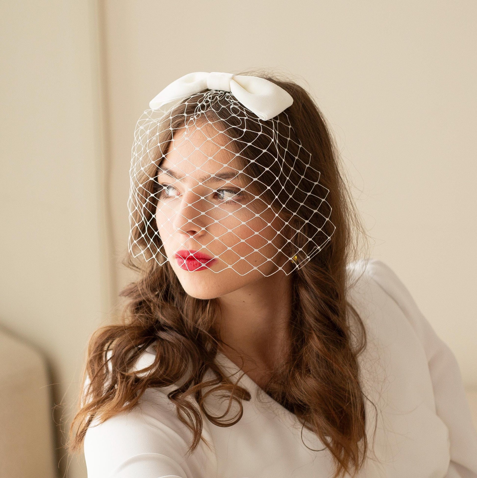Ivory Velvet Bow Birdcage Veil: Vintage Inspired Hairbow Blusher